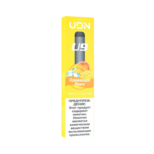 UDN U9 – компактная и удобная одноразовая сигарета на солевом никотине, отлично передающая вкус и рассчитанная на 350 затяжек, что равноценно примерно пачке сигарет. Объем вмещаемой жидкости составляет 1,5 мл, чего вполне должно хватить на 3-4 дня умеренного парения. Устройство не имеет лишних кнопок, активируется по затяжке, почти ничего не весит и прячется в ладони.