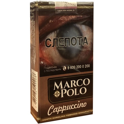Качественные американские сигариллы Марко Поло с ароматом капучино в мягкой пачке. Сигариллы состоят из натуральных резаных табачных листьев пяти сортов и обёрнуты в лист из восстановленного сырья.